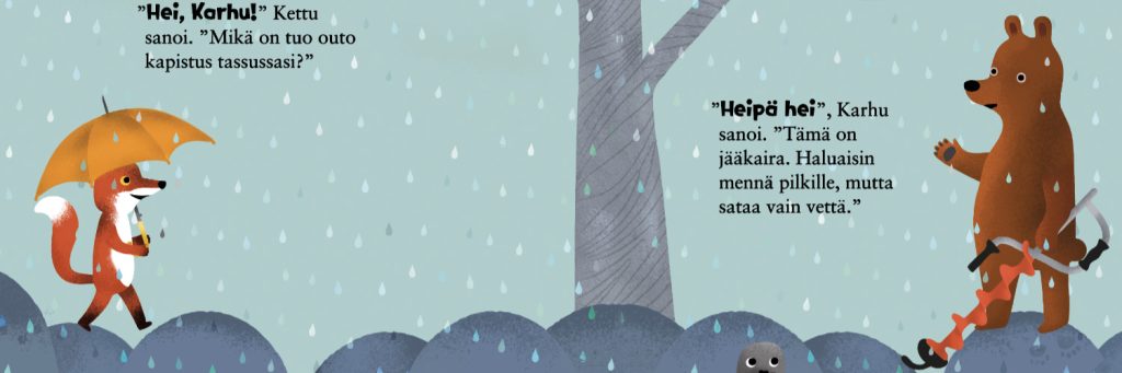 🇫🇮 Karhu haluaisi pilkille, mutta ei pääse jäälle — aina vain sataa. Kettu ehdottaa, että he lähtisivät yhdessä kohti pohjoista etsimään talvea. Matkalla mukaan liittyy yhä uusia eläinystäviä, ja lopulta lumihangille saapuu iloinen joukko.