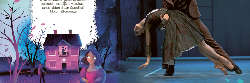 The book is written by Juhani Koivisto, dramaturg of the Finnish National Ballet, illustrated and designed by Ulla Sainio, and features photographs by Sakari Viika from Finnish National Ballet productions.