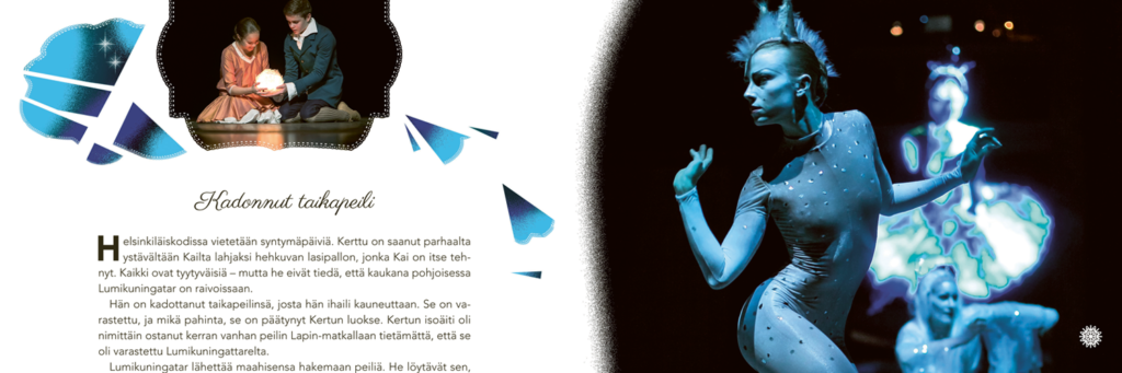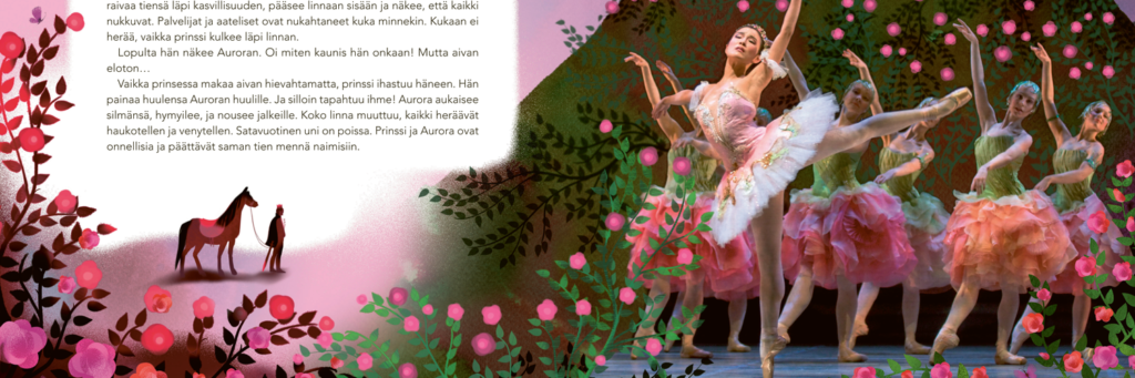 Tekstin on kirjoittanut Juhani Koivisto, Suomen Kansallisbaletin päädramaturgi. Kuvituksessa on käytetty runsaasti Sakari Viikan valokuvia Kansallisbaletin esityksistä, jotka tulvivat sadun lumoa ja tanssin kauneutta.